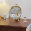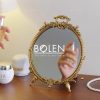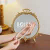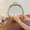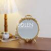 Gương trang điểm dáng tròn với hoa văn tinh tế, sắc sảo vừa có thể sử dụng để soi vừa như 1 item decor đẹp mắt cho bàn trang điểm.