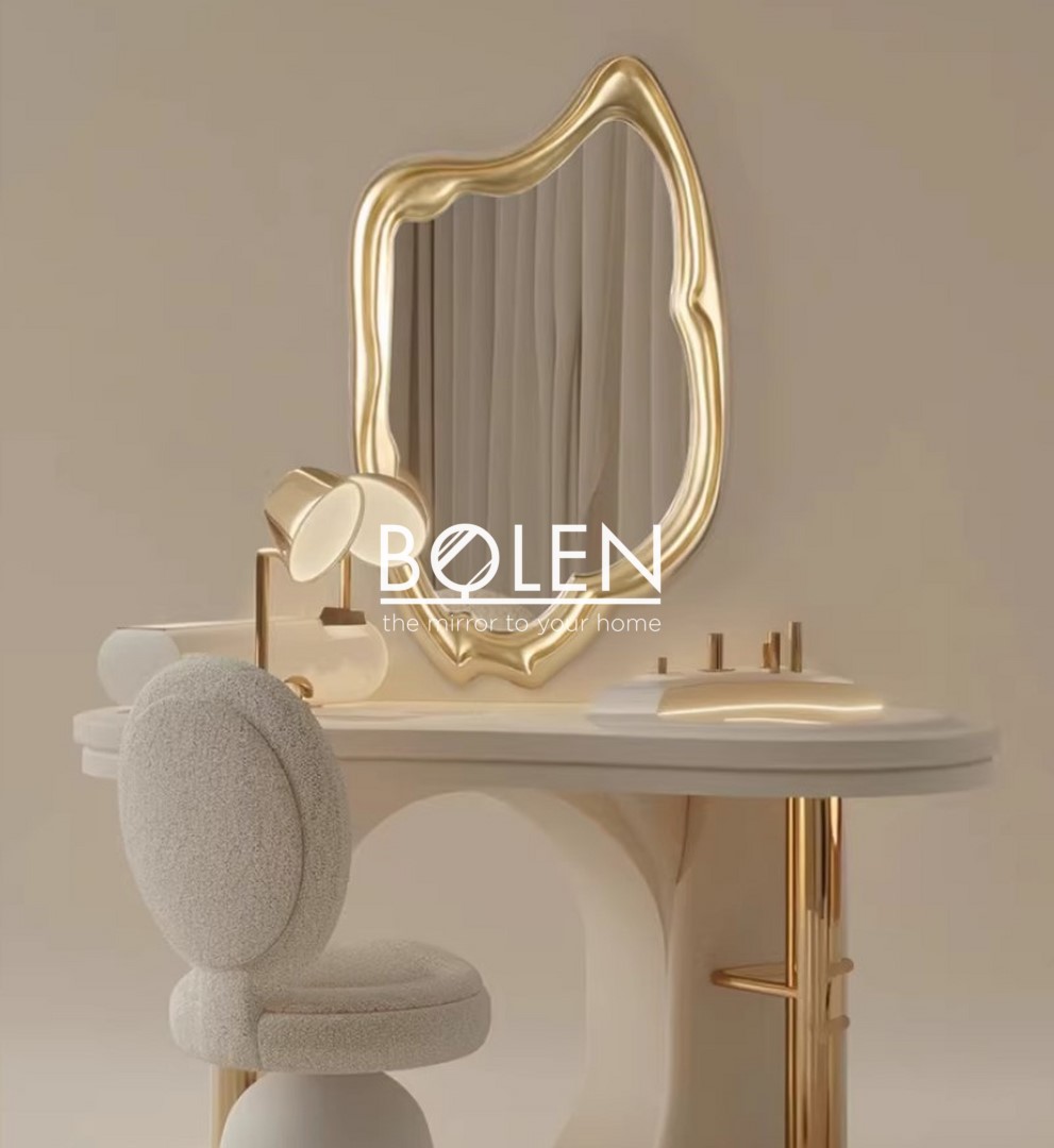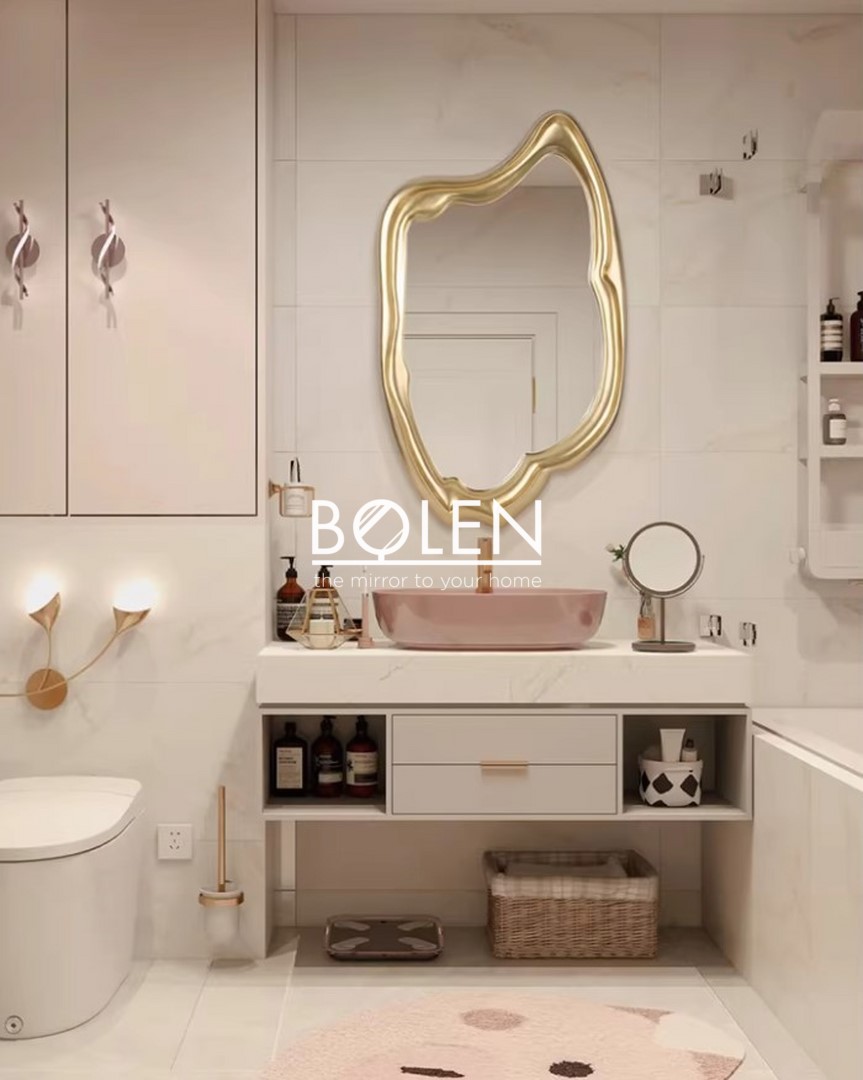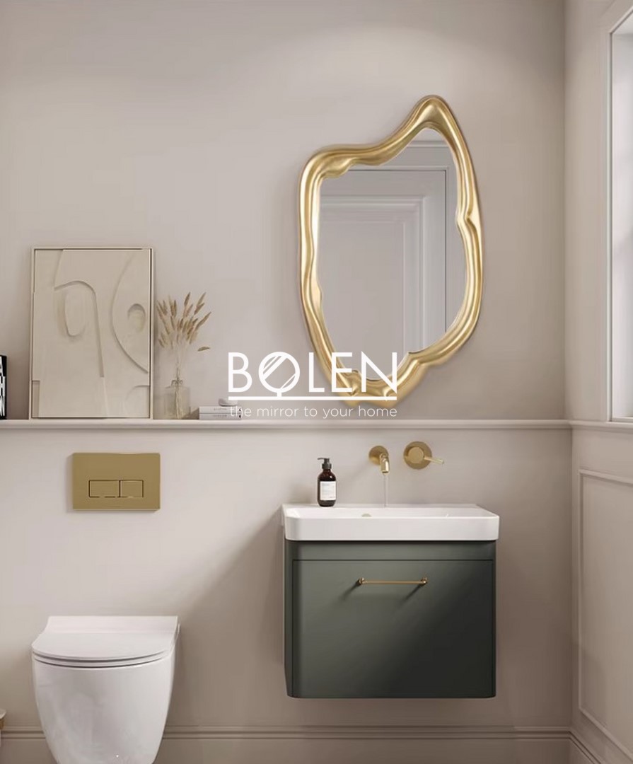 Gương có hình dáng đặc biệt tạo điểm nhấn cho căn phòng. Kết hợp với màu vàng sâm banh nhũ sang trọng.