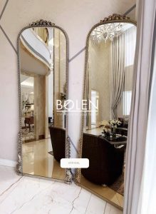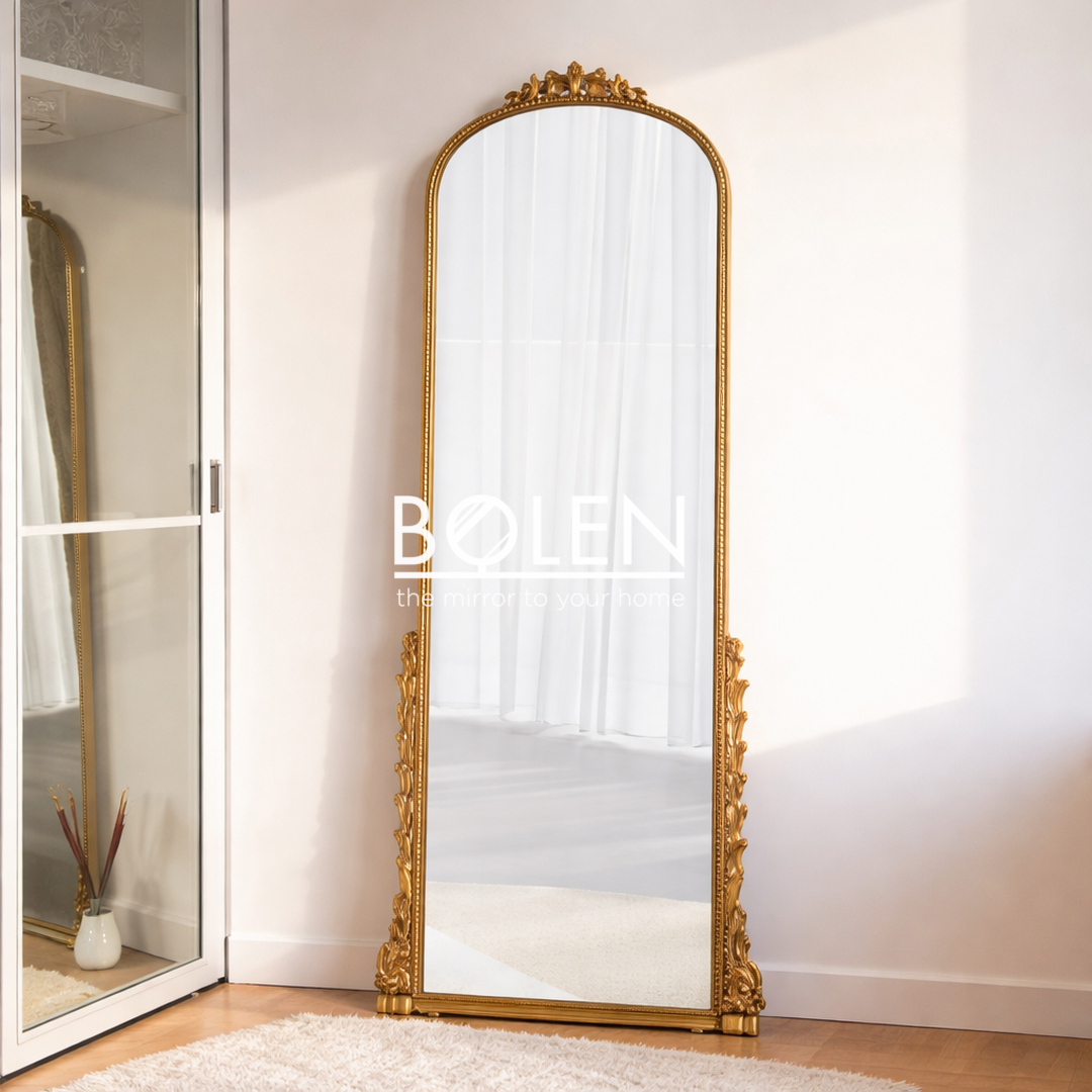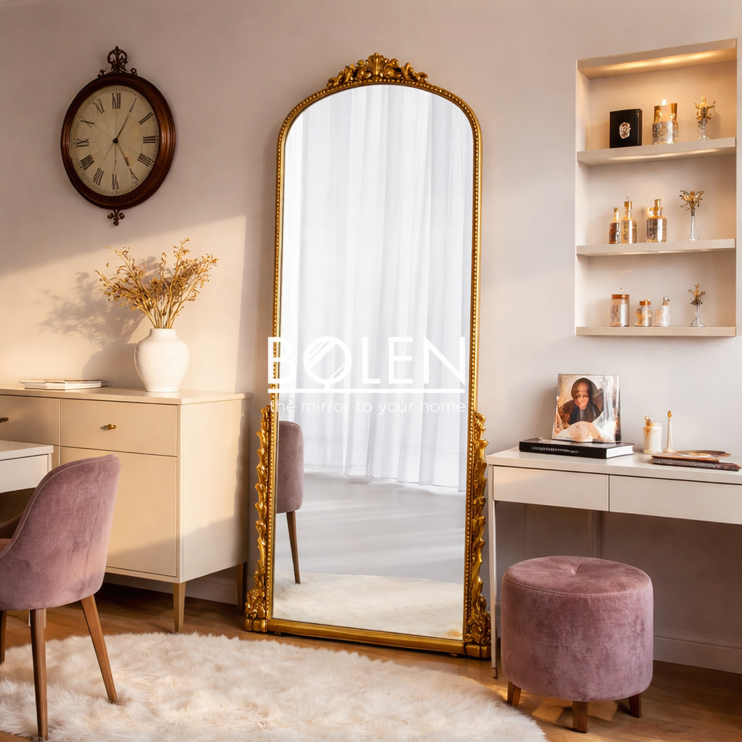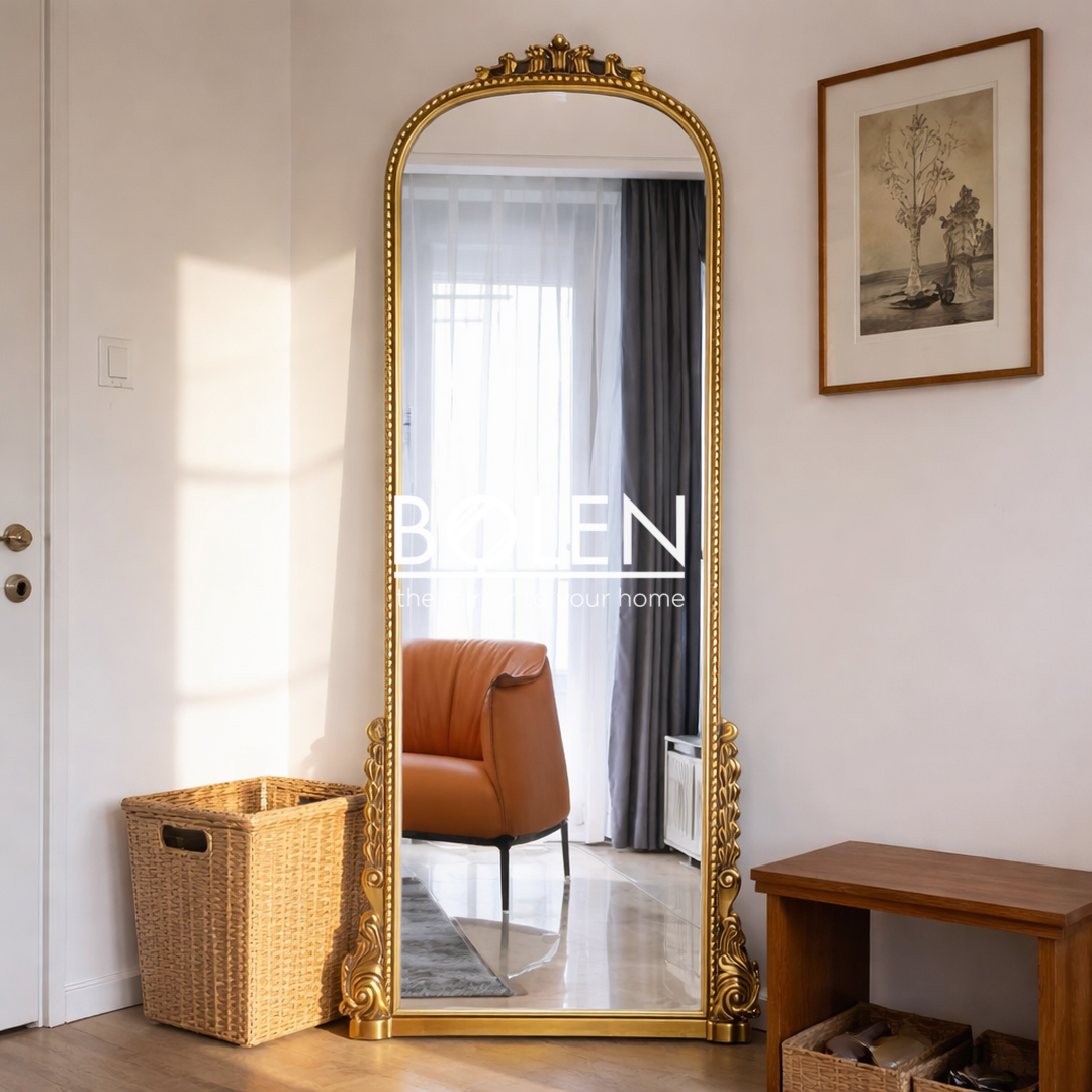 Gương soi toàn thân viền retro vàng cổ điển mang tới vẻ sang trọng cho căn phòng theo đuổi phong cách decor hơi hướng châu Âu.