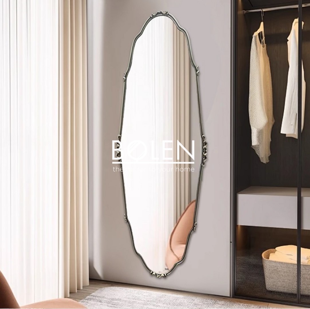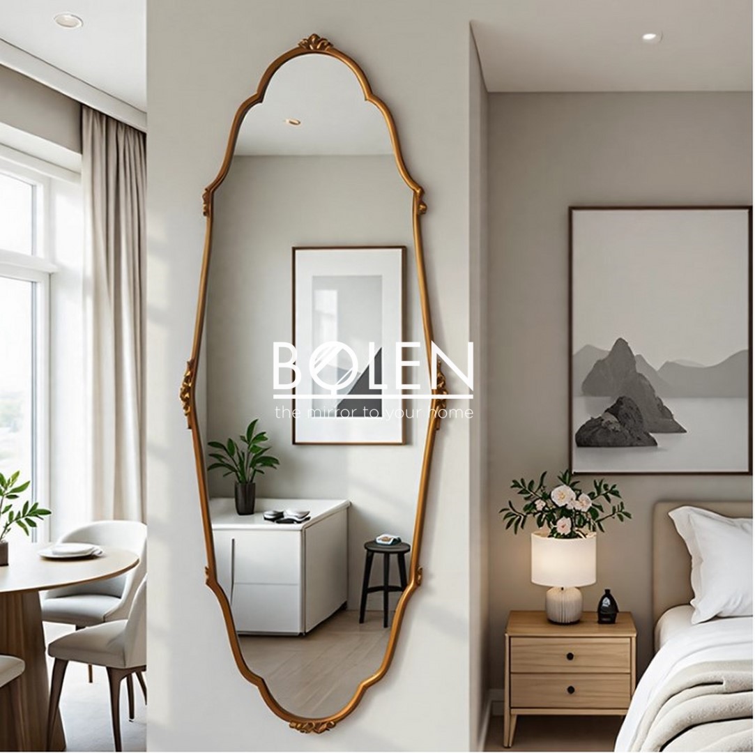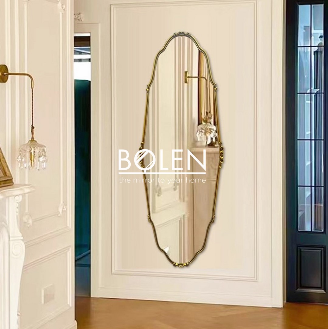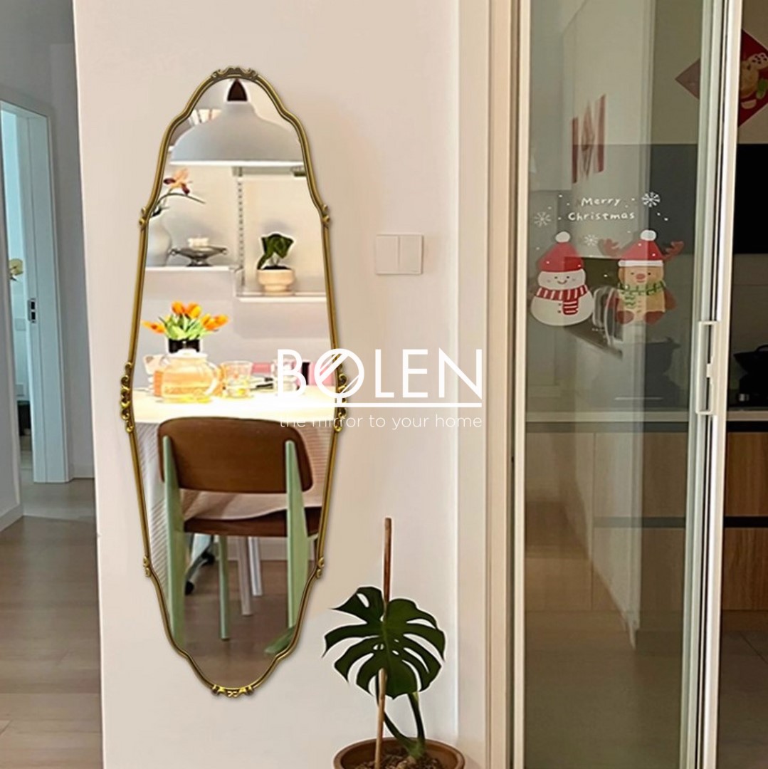 Gương body viền vintage dáng oval với họa tiết tinh tế ở các góc và đỉnh gương tạo cảm giác nhẹ nhàng, thanh thoát.