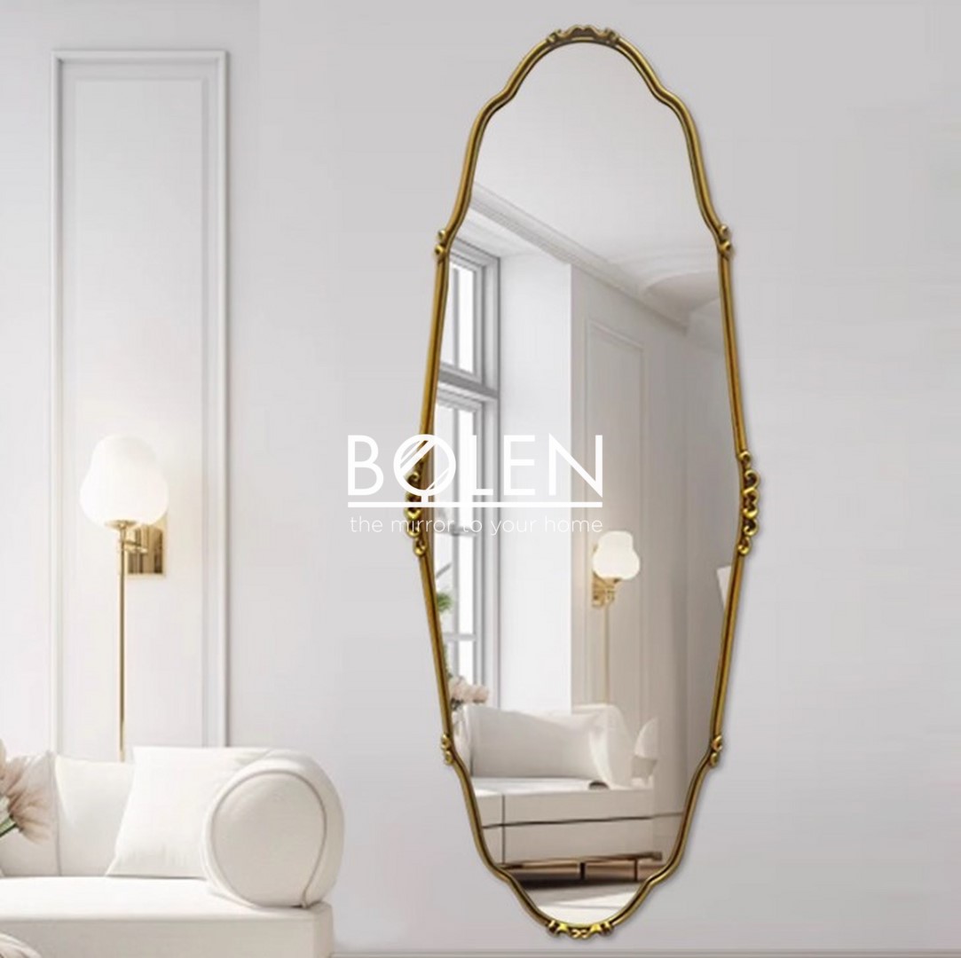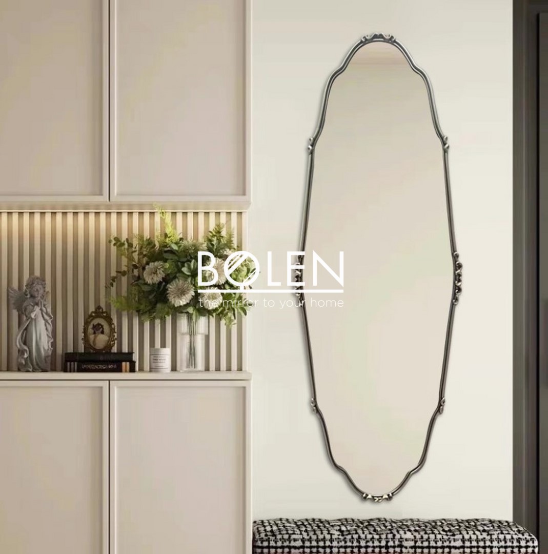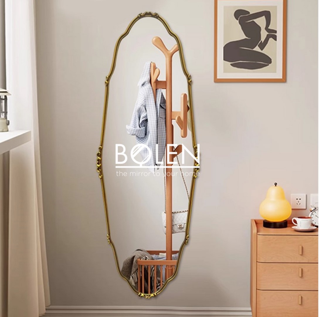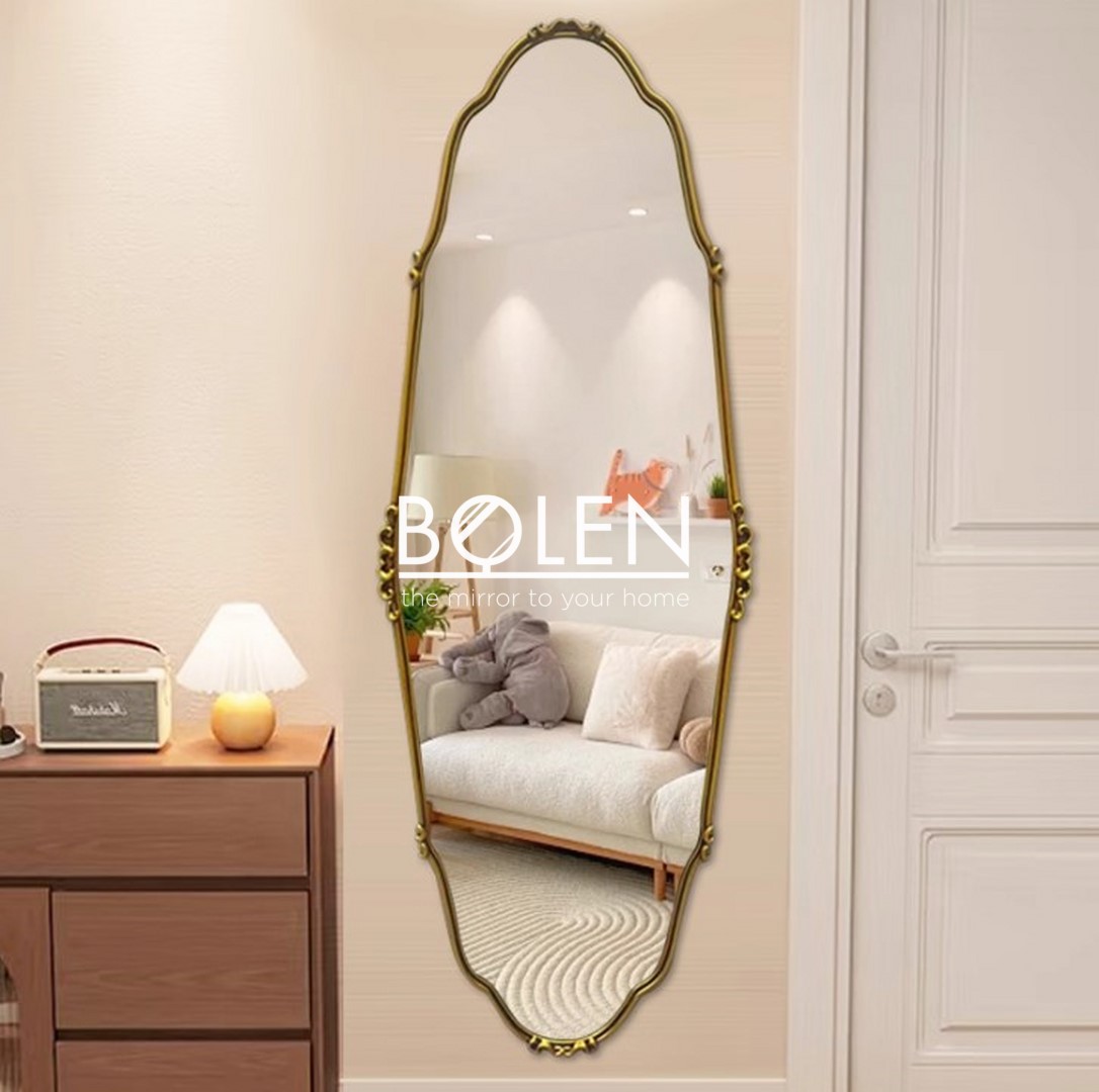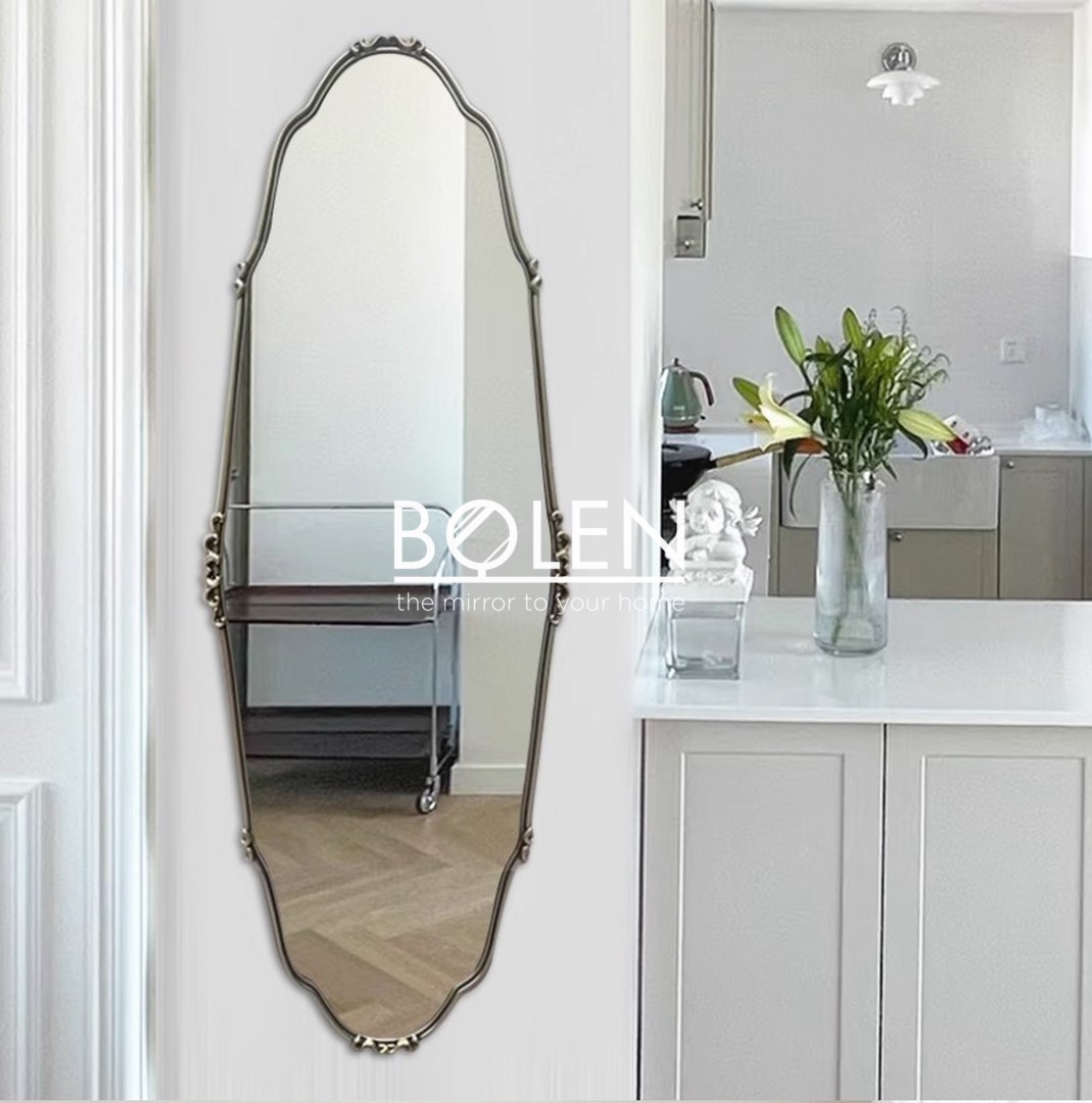 Gương body viền vintage dáng oval với họa tiết tinh tế ở các góc và đỉnh gương tạo cảm giác nhẹ nhàng, thanh thoát.