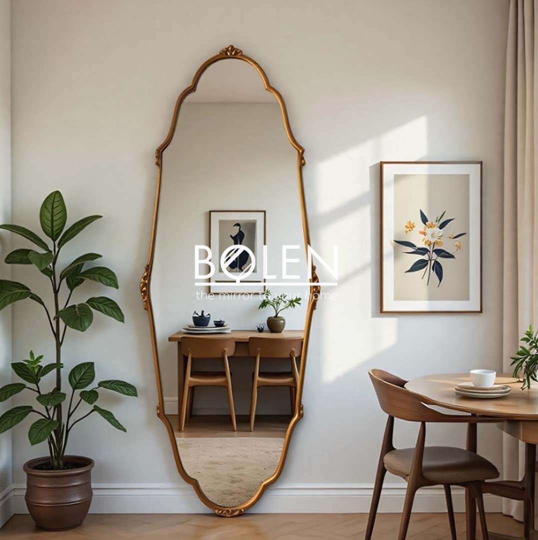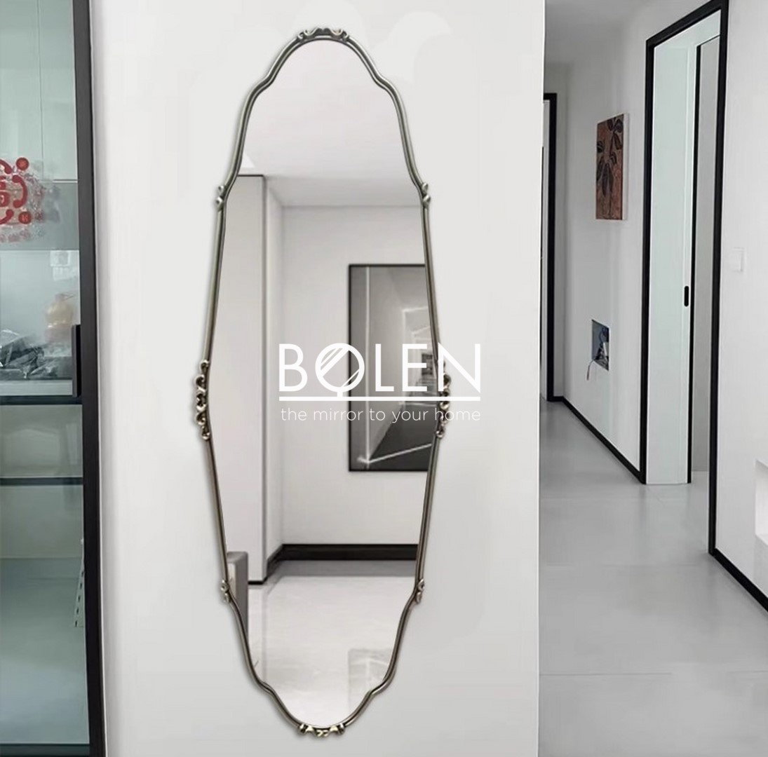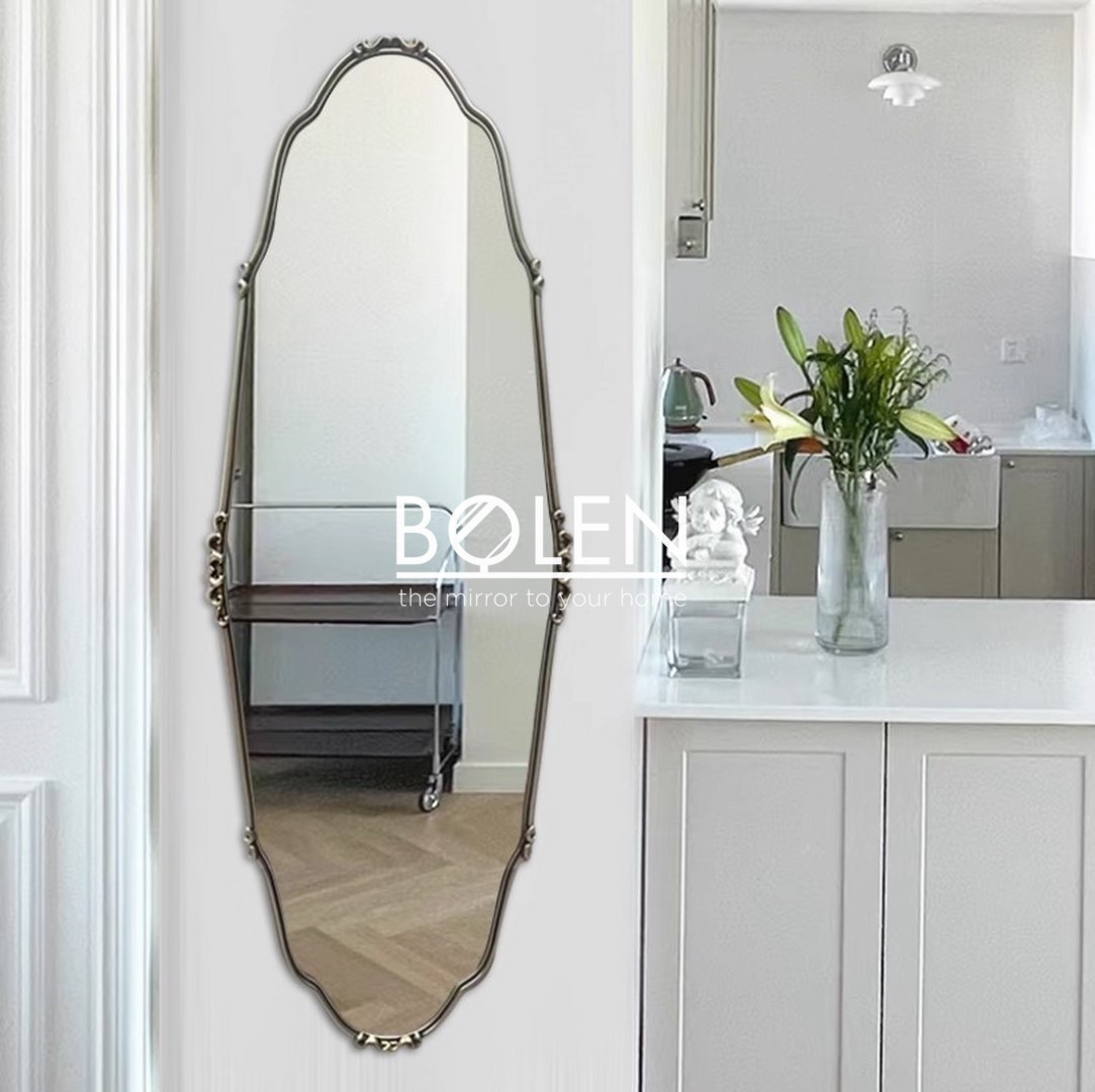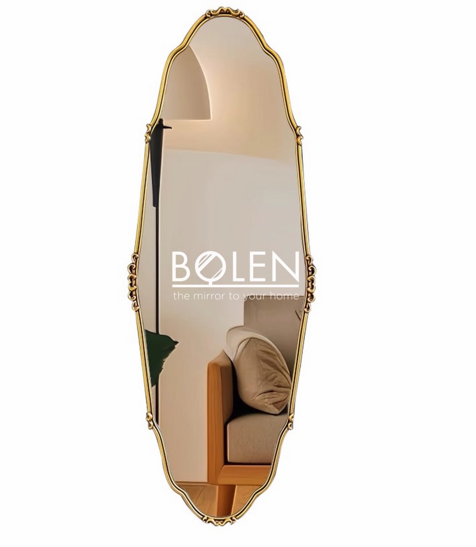 Gương body viền vintage dáng oval với họa tiết tinh tế ở các góc và đỉnh gương tạo cảm giác nhẹ nhàng, thanh thoát.